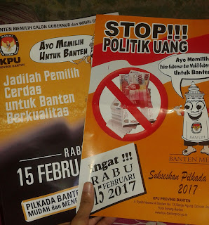Di provinsi saya, yaitu Banten, juga sama seperti Jakarta. Bakal ada pemilihan gubernur juga. Meski saya sendiri nggak paham sama persoalan hati politik, tapi setidaknya saya tau lah siapa paslon dari provinsi saya yang sekarang mungkin lagi sibuk kampanye di mana-mana. Adalah Wahidin Halim-Andhika Hazrumy, sebagai paslon nomor urut 1. Dan Rano Karno-Embay Mulya Syarif sebagai paslon dengan nomor urut 2.